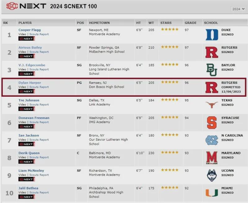 众多NCAA D1级名校均向他发出招募邀请,但他最终受到哥哥影响,选择了哥哥曾效力四年的罗格斯大学,该校球队在NCAA联盟并不属于强队,球队自1906年建队以来总计只打进过8次疯狂三月,而小罗恩-哈珀是这球队的传奇,在2021、2022连续两年带领球队打进了疯狂三月,他和球队主教练史蒂夫-皮基尔情如父子,在哥哥的积极招募下,弟弟迪伦也加入这所大学,而且还有一个重要原因就是在迪伦之前,罗格斯大学还破天荒的招募到了百大高中生排名第2的艾斯-贝利,这也是校史招募到的排位最高的高中生,后来经媒体披露,罗格斯大学在招募贝利的见面会中明确承诺迪伦一定会加入球队,两名全美数一数二的高中生双剑合璧.