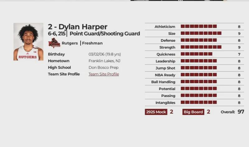我将迪伦在NBA DRAFT网站最后一份选秀报告放上来做参考(略有删减),综合评分97分,预计选秀顺位第二顺位,除了在Quickness敏捷性方面评分7分稍显不足外,其他方面无短板,选秀模板坎宁安.