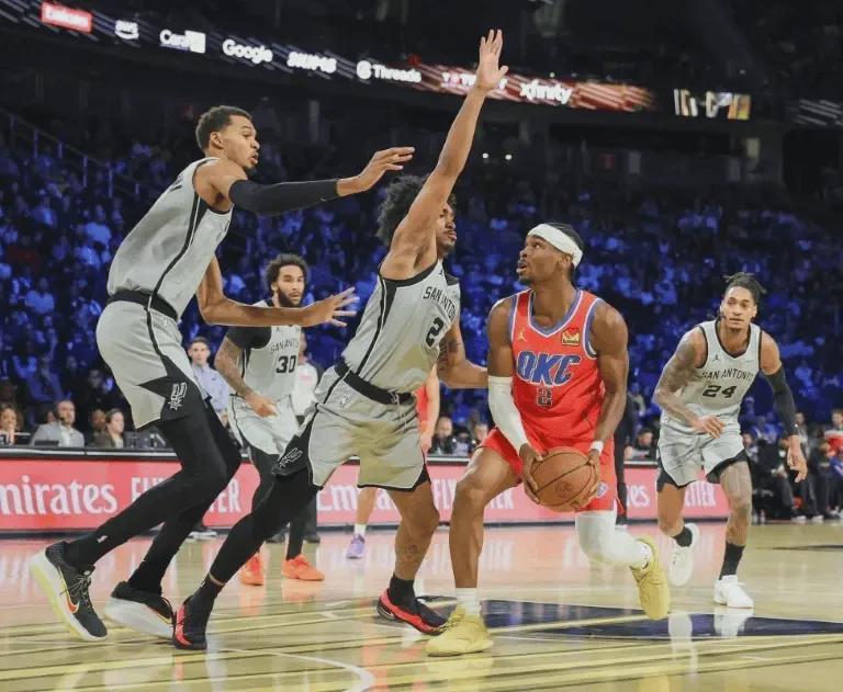 防守端马刺队有文班亚马这个BUG级的联盟最佳防守球员,所以球队防守体系非常容易建立,目前球队防守效率113.1排名全联盟第6,队内所有球员在这个体系中都有防守加成,简单点说,即便第一层外线防守被突破,对手进入内线面对的也是恐怖的文班亚马封盖干扰,马刺队外线防守球员只需紧跟进攻人,不给投篮空间,甚至可以故意把他驱赶到文班亚马的防守覆盖区遭受打击,防守压力相比其他球队减少一个级别.