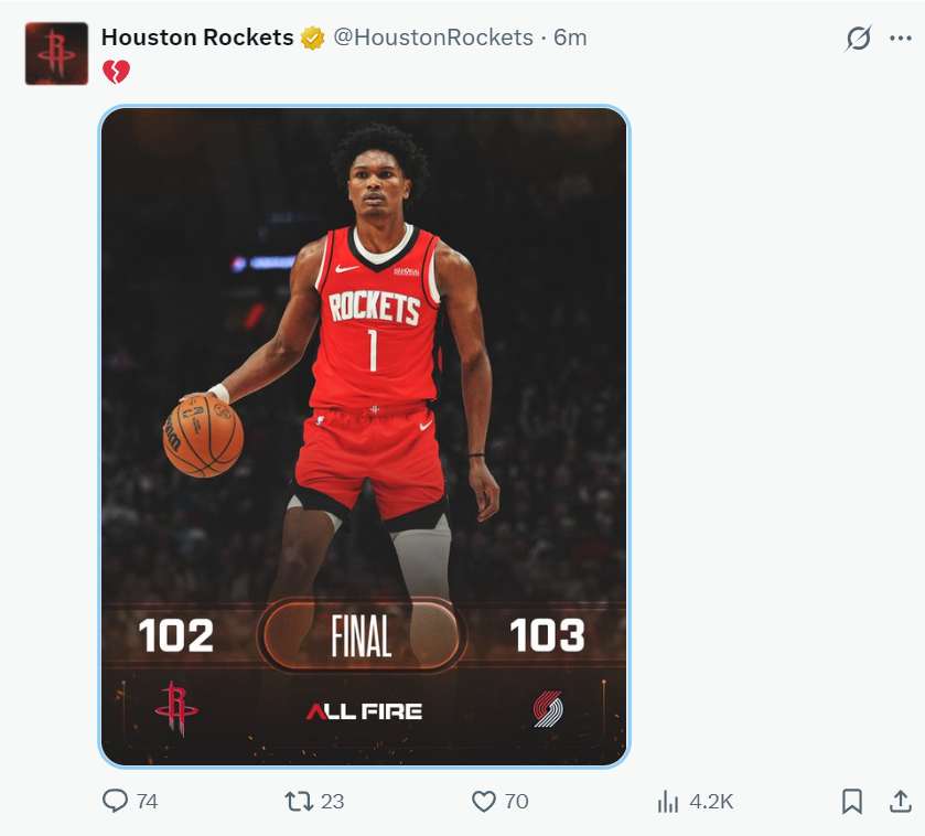 这场比赛后火箭直接从西部第四直落到西部第六,火箭与湖人都拉开0.5个胜场,没有约基奇的掘金接连击败凯尔特人、费城76人再度回到西部第三的位置。