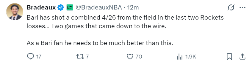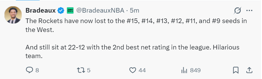 火箭队记Bradeaux写道:火箭队近期接连输给西部排名15、14、13、12、11、9的球队,目前火箭战绩22胜12负,火箭净胜分联盟第二,这真是一支有趣的球队。