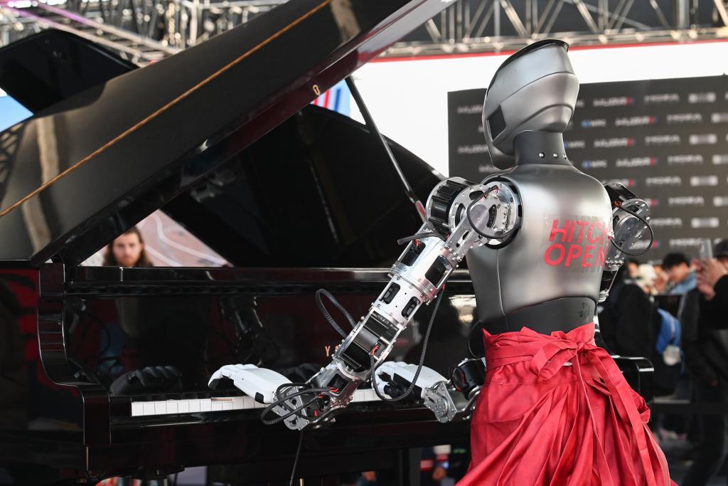 2026年3月13日,上海汽车文化节上,一个机器人正在弹钢琴。